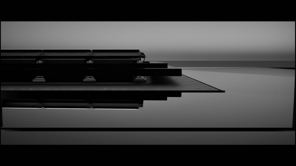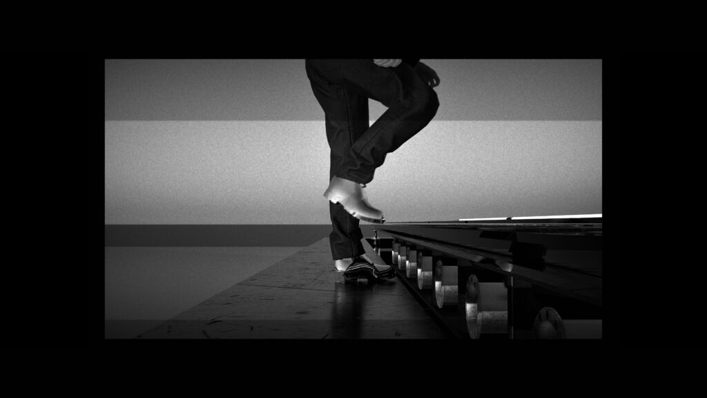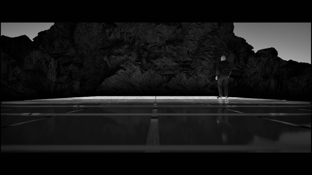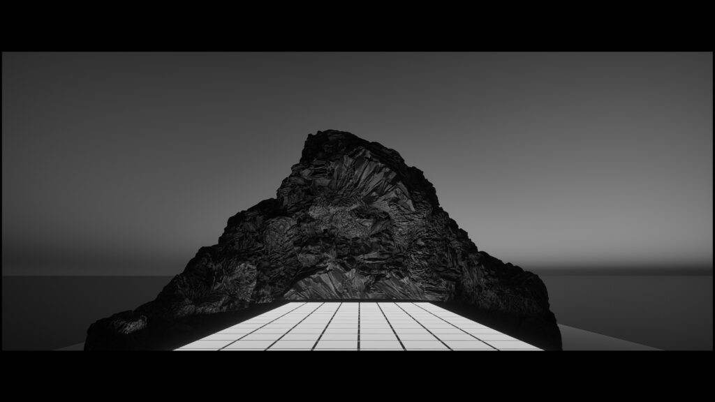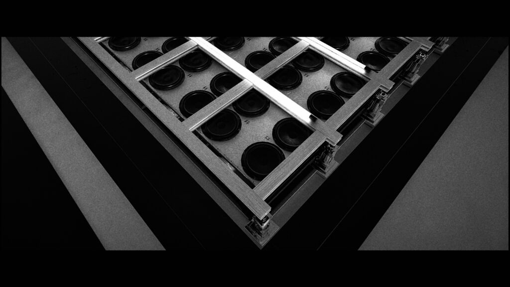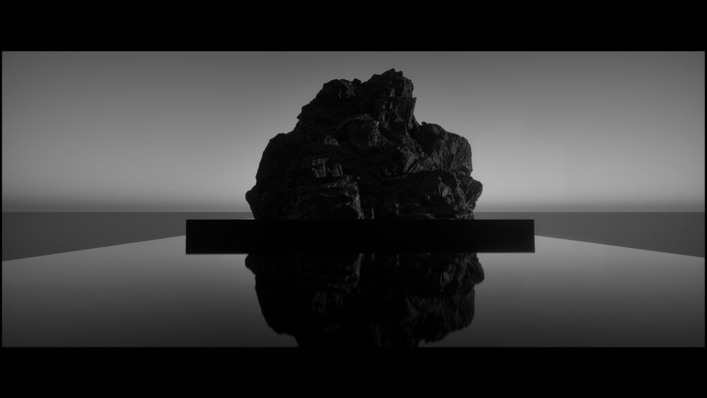 In this installation, the raw materiality of the stone provides a primal, immovable foundation, contrasting with the dynamic screen. Acting as both the experimental enhancer and the main character, the raw sound serves as the vital connective link of the piece. This auditory layer interacts directly with the observer’s first point of physical contact, the floor.